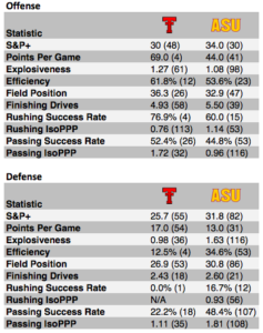 Kind of a mixed bag here for Texas Tech and a bit surprised that Texas Tech is so low on explosiveness, but very pleased that Texas Tech is doing so well in efficiency. And don’t fool yourself, that jump in field position is directly related to the punt returns. That’s a good thing. A bit shocked by the Rushing Success Rate, but it’s a small sample size. For Arizona State, nothing really jumps out at me other than they’re generally a top 30 offense and they grind the ball, much like the numbers above indicate. The Sun Devils are much better at running the ball than passing the ball and that’s not really a surprise.