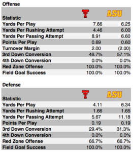 Texas Tech appears to be a bit better than Arizona State in the per play stats, largely because Patrick Mahomes is a better passer than the Arizona quarterback. Despite Texas Tech not running the ball that much, I think that about 4.5 yards a carry is just fine considering the lack of a running game for Texas Tech. One key that probably kept the game close for Arizona State against Northern Arizona is the turnover margin, being in the negative for ASU and positive for Texas Tech.