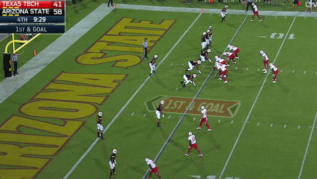 Arizona is aligned in an overload blitz on the right side of the offensive line. Texas Tech hasn’t shown a lot of inside zone runs, instead running outside zone opposite of where the running back lines up pre-snap. There is actually unblocked defenders on both ends of the line, one by design of the offense and the other because the blitzes outnumbered the offensive blockers. Terence Steele lets the defensive end get upfield as the read man (look at where Mahomes is looking when he’s handing the ball off). Steele instead takes the inside defensive tackle, and the left guard (Baylen Brown?) moves upfield to take on the linebacker. The safeties are moved up on the right side of the line for the blitz and covering the outside slot receiver. The middle of the field is left wide open once Mahomes makes the correct read.