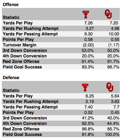 Defensively, Oklahoma does struggle against the pass, but they’ve been nails against the run and better than Texas Tech on their conversion rates against opposing offenses, although I would have figured they would have had a better third down conversion rate. I’d guess that the difference is that passing teams are still able to convert passes on third downs against the Sooners, but those teams generally had ground games that couldn’t be ignored.