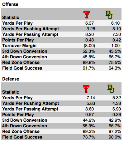 Not only that, but to be +1 in the turnover margin to Texas Tech’s -8 is probably why they’ve won 6 games and Texas Tech has only won 4. I’m a bit surprised that the third down efficiency isn’t there for Baylor as I would have expected a bit more from Baylor, but everything else is just fine. For Texas Tech, the offensive stats are really coming back down to earth a bit after the ISU game, there were some significant drops on the year.