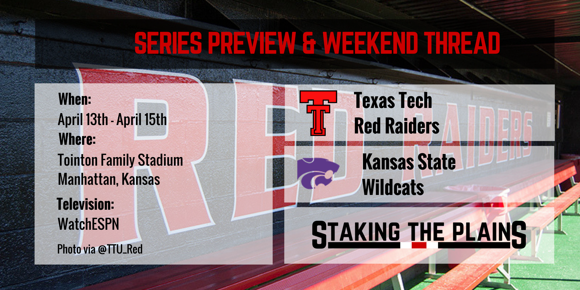 Kansas State is a pretty good pitching team, but not so great hitting the ball and not a team that knocks the ball out of the ballpark. Kansas State was okay in non-conference, but has been swept by Texas and by TCU, and then lost 2 of 3 to Oklahoma State. This would be a series that Texas Tech needs to sweep this series. Texas Tech is sitting second behind TCU and tied with West Virginia at 6-3 overall. As an aside, TCU is playing West Virginia this weekend, in Morgantown, and Texas Tech takes on TCU in two weekends, starting April 28th.