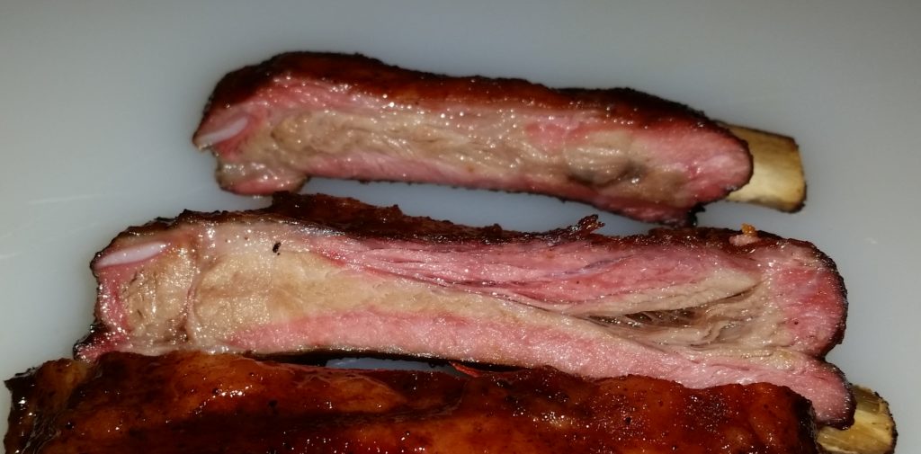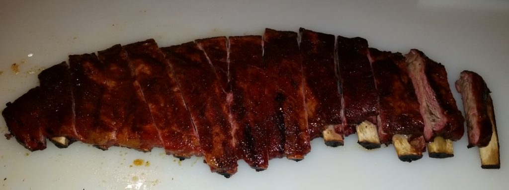 They could and probably should have gone a bit longer to achieve maximum tenderness, but the baby had just been put to bed and it was time for the adults to eat. You can see that the right side of the rack turned out better than the left with the meat pulling away from the bone.