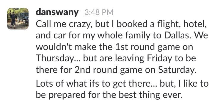 Swany: Man, I had a feeling it would happen. So, I asked Jessica if they got an invite to Dallas and won the first round game could we go and watch it. I said it was a slim chance we grab the #3 seed in Dallas, and she bought it. I set-up the flight, hotel, and rental car 2 hours before the announcement. We watch as a family, and I started cheering as it was announced. Maddie was in my arms and I started chanting “We’re going to Dallas!” It was epic… so, you could say I was fairly excited about the good news.