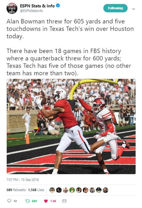 As I sat in Jones AT&T Stadium Saturday I realized that I was watching a return to form. Maybe it’s not the perfect form (we don’t want ‘Bama) but it’s the form that I’d surmise many Red Raider fans have come to hope for and enjoy. The Texas Tech offense was pretty much prolific Saturday. I know the running game didn’t get going the way Kliff would like, but Bowman and company were able to stretch the field vertically and keep Houston’s defense running and on their heels when it counted. I’m certainly not saying I’m happy to see the defense giving up 49 points, but I was happy to watch a brand of Texas Tech football that I enjoyed for over a decade. I may not have realized until yesterday how much I’d missed it. A tweet from ESPN Stats & Info really captured what has always made this brand of football fun, exciting, and yes sometimes infuriating.