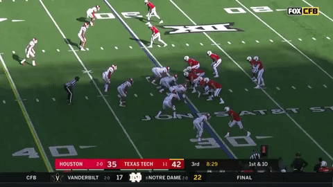 Freshman Alan Bowman is now a record-setting Texas Tech quarterback. Bowman broke Patrick Mahomes’s Big 12 record for most passing yards in a game by a freshman. Bowman finished the day 43/59 for 605 yards and 5 touchdowns. That’s a QBR of 91.4, a completion percentage of 72.8%, and an average of 10.3 yards per completion. So from Lamar to Houston, we saw Bowman drop only 1.5 yards per completion and his QBR dropped a little under four points. That’s not too shabby from a bad FCS team to a 2-0 FBS G5 team with the best defensive lineman in the country. Bowman continues to take excellent care of the football. He is still without an interception in 133 passes and has no fumbles in 264 snaps handled. Credit also goes to the offensive line, giving up the first and only sack this season Saturday to Houston. Bowman continues to show a strong grasp of this offense and has obviously gained full confidence in his outside receivers. Bowman does a good job moving the pocket and creating time and space to make the right throw. He threaded the needle today and went over the top successfully. As always he wasn’t perfect and there’s always room for improvement. He’s been thrust into a difficult situation and only the grumpiest observer can complain about his play at this point. You can see Bowman’s touchdown passes on other awards, so below are gifs of some other great throws.