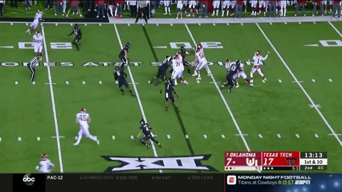 Bowman went 21/27 for 237 yards and 2 touchdowns. That’s an average of 8.7 yards per attempt, which is what the Sooners averaged offensively for the night. He was never sacked and his one rush for 3 yards is the play that ended his evening. Bowman was sharp and managed the Oklahoma pass rush exceptionally well. It’s apparent that Bowman sees the field very well and he is a student of the game. He carves up secondaries and his ability to read coverages and blitzes is impressive. While the Red Raider running game didn’t get rolling, the screen game did and that’s always been Tech’s answer when rushing proves difficult. Bowman continues to show great command of this offense and good chemistry with his various receivers. He is accurate on the run but he does throw off his back foot at times. This immediately reminds me of Taylor Potts, at which point I black out and wake up having burned all of my belongings. I prefer when Bowman doesn’t do that. Also, the downfield blocking on that Ward run was exceptional, and his cut to embarrass the OU defender was one of my favorite moments of the night.