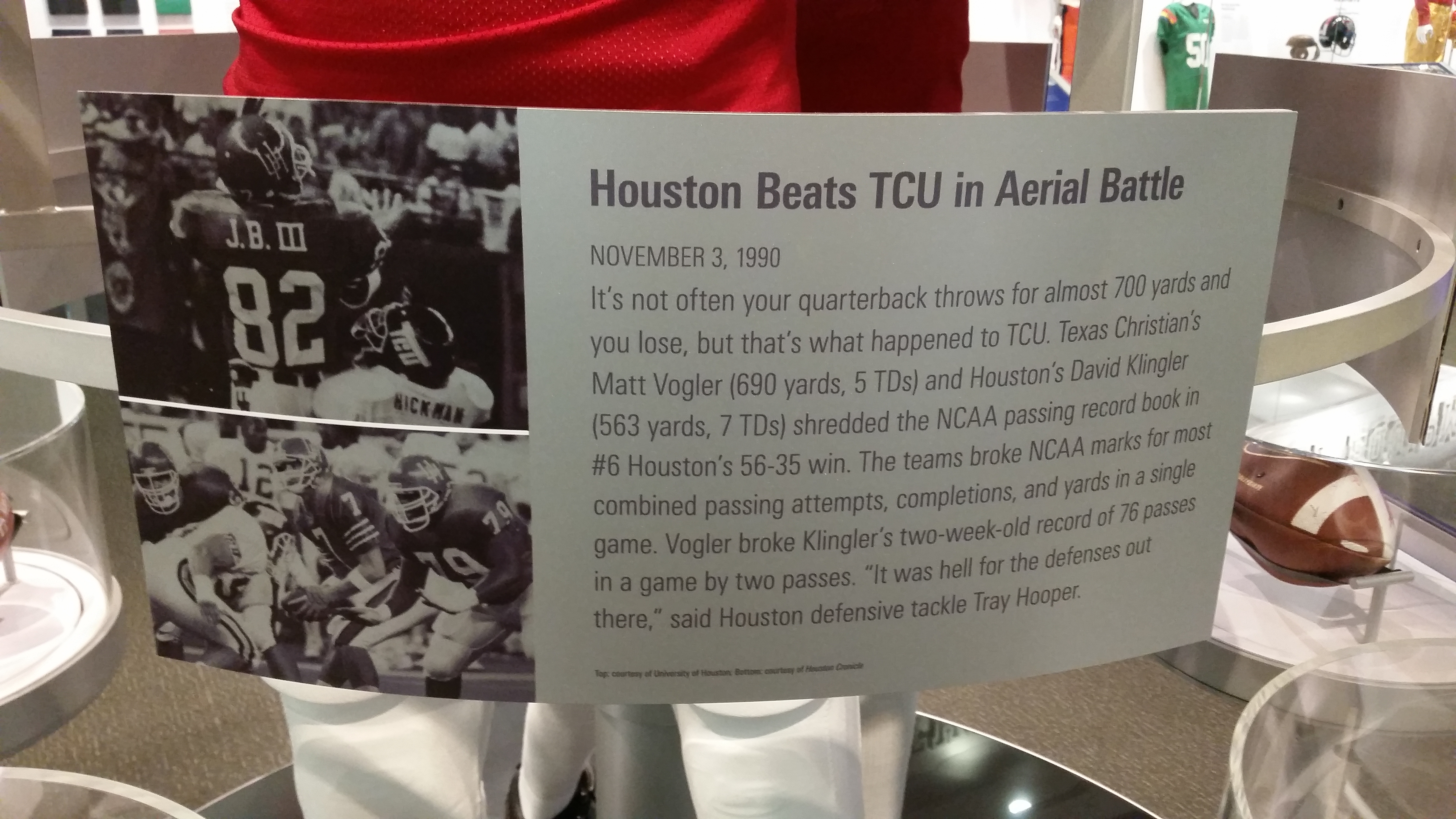 Up next was something very loosely associated with Texas Tech as it pointed out a few records that have since been broken by our Man with the Golden Arm. The College Football Hall of Fame opened its doors in August 2014, or as we call it around here, Pre-Mahomes. Time for an update.