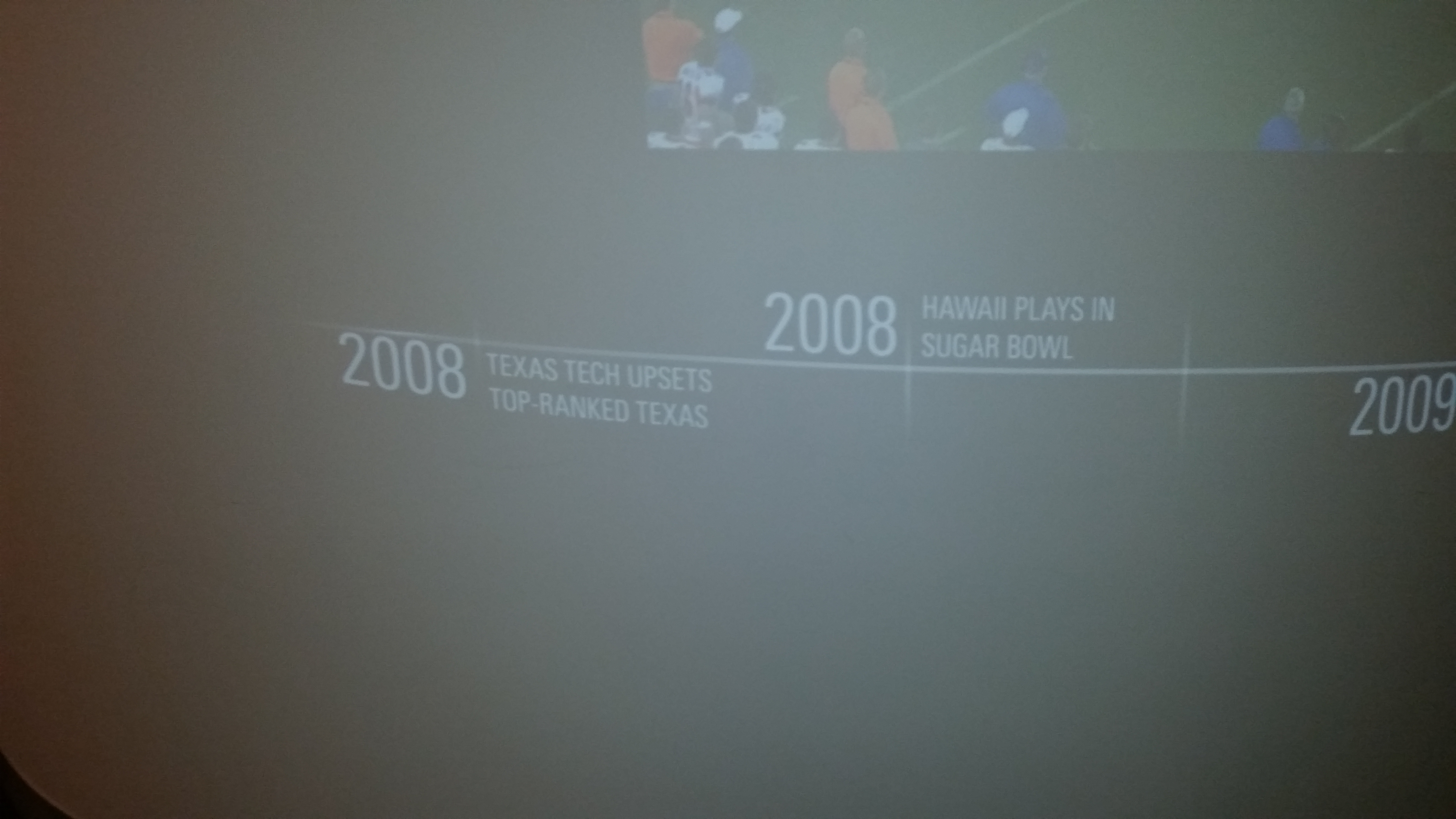 And, finally, how would we feel if our claim to fame was left out of the Hall entirely? Not good, I reckon. I snagged this photo during a video showing notable occurrences along a timeline. Here we are, right next to Hawaii’s Rainbow Warriors making it to the Sugar Bowl.