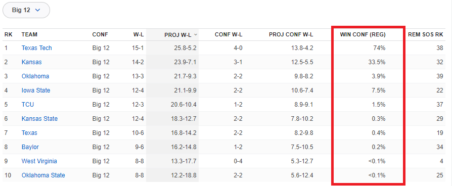 Next, here is the remaining schedule with BPI’s predicted win probability for Texas Tech. These numbers haven’t moved more than a few points (if at all) throughout the season, but I’ll keep posting it so that y’all can reference it for the upcoming games and beyond.
