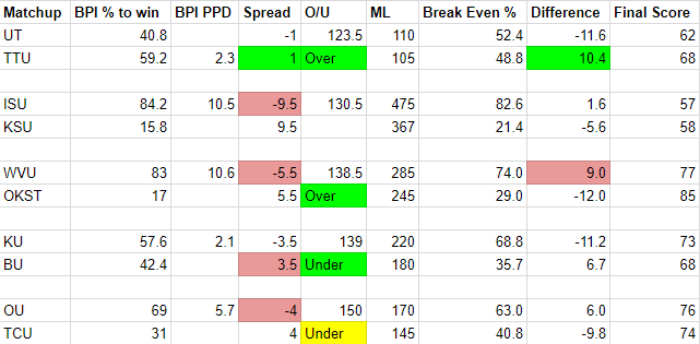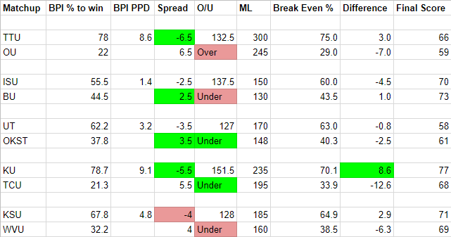 Like I do with Texas Tech’s season outlook each week, ESPN’s Basketball Power Index (BPI) is the starting point for how I pick games. BPI assigns each team a win probability, as well as a predicted point differntial (PPD). These are represented in the first two columns next to the matchups below. So betting against the spread is straightforward; find the spread, compare it to BPI’s PPD, and bet accordingly. So for example, BPI predicted Texas Tech would beat Oklahoma by 8.6 points last week. The spread was just Texas Tech -6.5, meaning BPI expected Texas Tech to cover the spread. I picked accordingly. Texas Tech won by 7 points, making it a winning bet, and therefore highlighted in green.