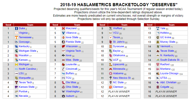 Our buddy Erik Haslam over at Haslametrics places Tech in the highest seating as a #4 seed. This is consistent with what the bracketologist’s are thinking in their seeding predictions. Note that Kansas is a #2 seed, that game in Lubbock is going to have major implications on all these seeding forecasts.