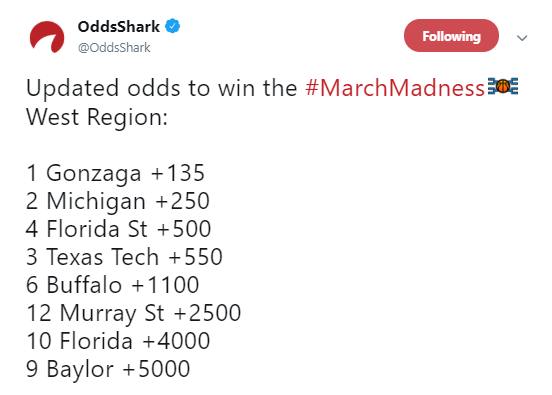 FiveThirtyEight currently has the odds to win the region and reach the Final Four at 50 percent for Gonzaga, 17 percent for Michigan, 15 percent for Texas Tech, 9 percent for Florida State, 4 percent for Buffalo and nobody else higher than 2 percent.
