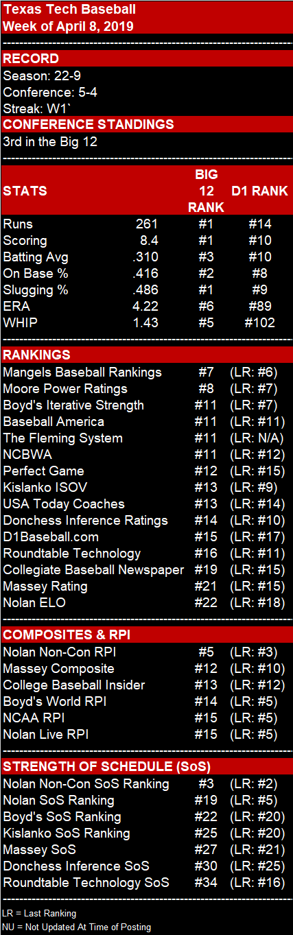 Texas Tech saw some slippage in the RPI this week, mostly due to a reduction in their very high strength of schedule numbers. The Texas Longhorns have struggled lately splitting a series with Baylor, losing a midweek to Texas A&M at home and another to Incarnate Word, losing a series to TCU, and splitting a midweek with Arkansas in Austin as well. The struggling ‘Horns hurt Tech’s overall strength of schedule and ultimately the RPI. Losing a home game to Kansas certainly didn’t help matters either. As the Red Raiders continue to move forward those effects will even out more and more.