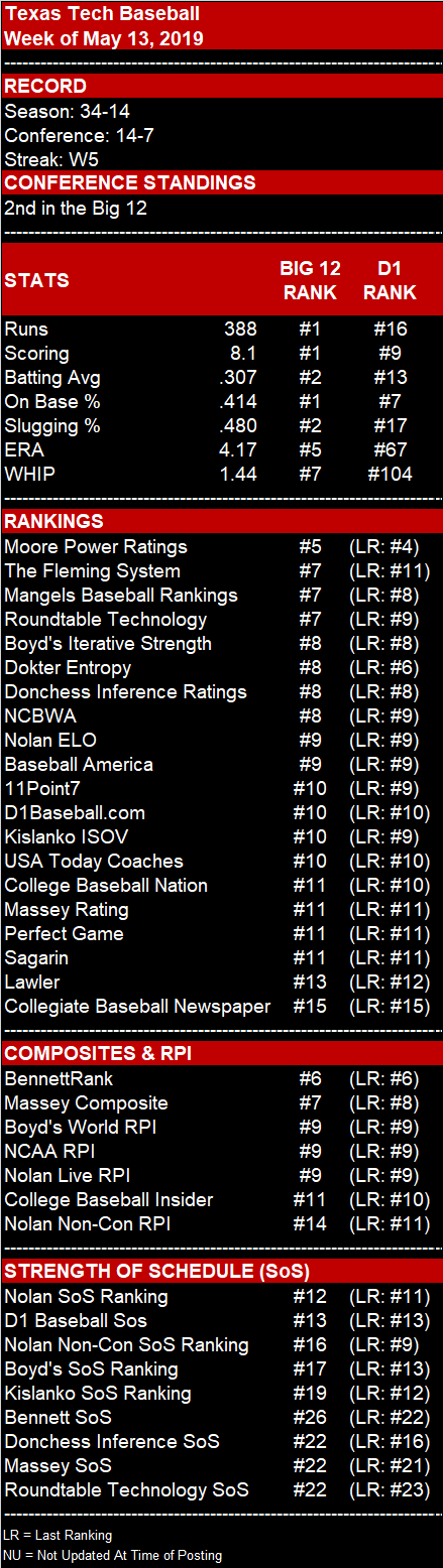 The final x-factor is the teams currently above the Red Raiders in the national seed projections, most notably Louisville, Georgia Tech, and Georgia. Louisville lost a series to Virginia most recently but beat a solid Indiana team in the midweek. They host Florida State in their season finale series, the ‘Noles are not world-beaters this season but it’s Mike Martin’s final season and they are expected to make the tournament, probably as a Regional 3 seed. By jumping up and biting Louisville FSU could help the Red Raiders immensely. Georgia Tech is facing Pitt, the worst team in the ACC, at home this weekend. I don’t expect much help from the Panthers but it’s baseball so you never know. Georgia is hosting the abysmal Alabama Roll-Tidephants. ‘Bama is tied at the bottom of the SEC with South Carolina and Kentucky, again, not a team I expect a lot of help from this weekend. So if you feel like rooting for some extra teams in the final weekend of the regular season, I suggest getting on board with the ‘Pokes of Xerox U hosting the Baylor Bears and the Fighting Mike Martins of Florida State as they face Louisville.