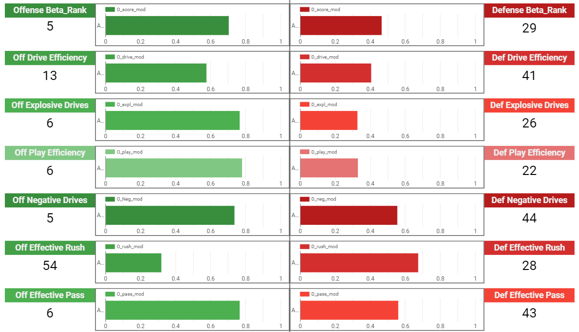 Sharp College Football Beta Rank Deep Dive: This was an offense that was highly explosive and efficient and particularly adept at the passing game, which isn’t a surprise considering what’s returning. This is a top 5 offense in the nation and if they can figure out the offensive line situation, it could be the same as last year. I think that Brennen’s forte is defense and they were also very good last year. Not elite at anything, but very good, particularly good against the run.