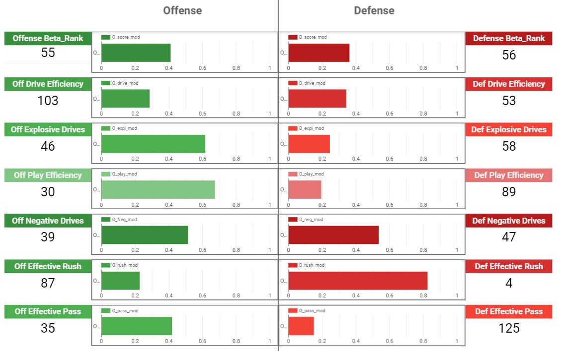 Sharp College Football Beta Rank Deep Dive: Mid? Is that what this is, just right down the middle okay, but with an excellent record? The running game, despite having a terrific running back, was just okay and Bowman throwing the ball was the star of the show. Cutting down on negative drives is huge offensively. Defensively, the Cowboys were stellar stopping the run and not great stopping the pass. That’s maybe the biggest split I’ve seen.