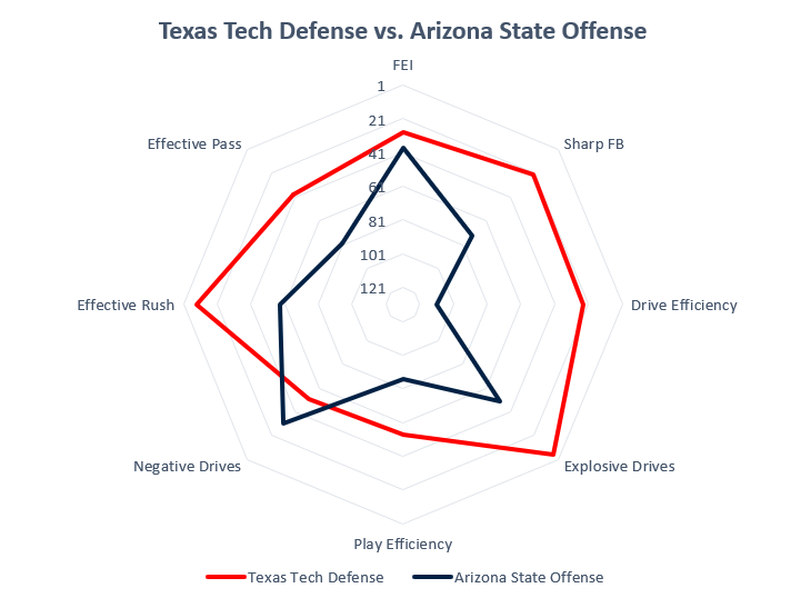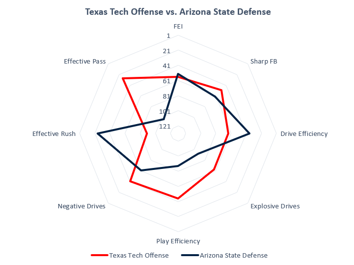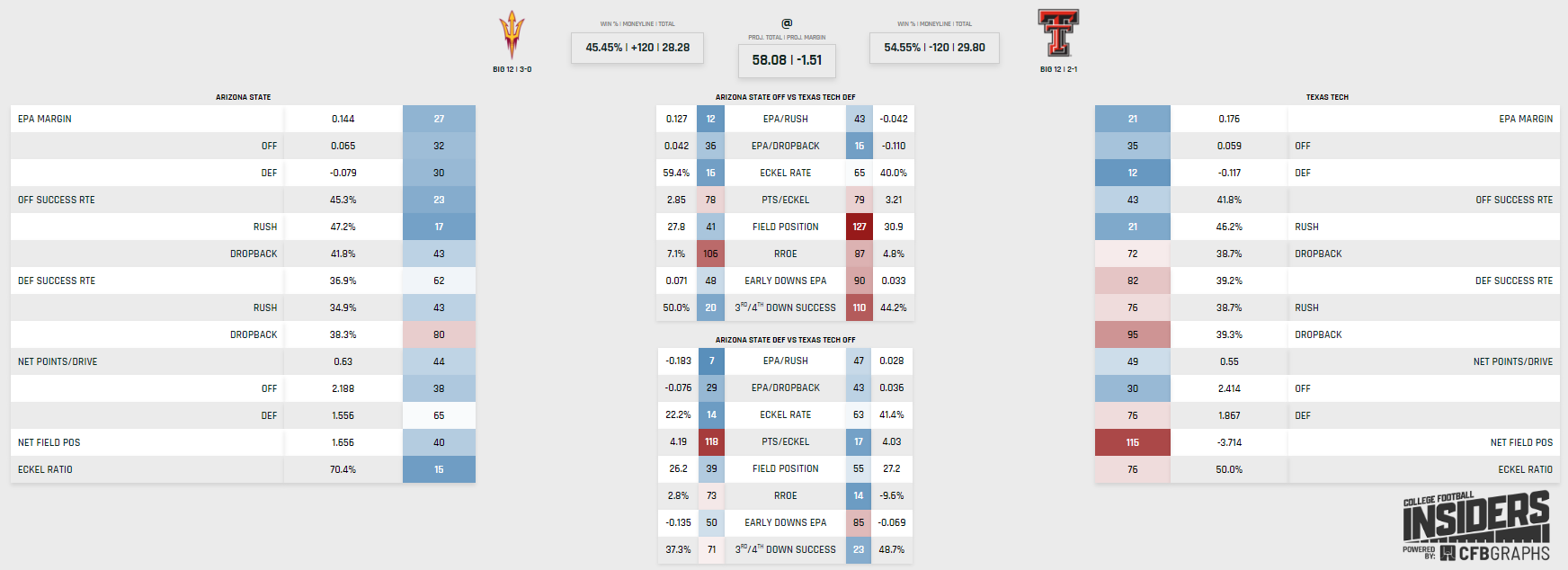 Arizona State is great at stopping the run, which relates this game hinging on Morton more than Brooks. And ASU is terrible stopping the pass, so take that with a grain of salt. The Sun Devils are also prone to give up big plays, and Texas Tech is good at reducing negative drives and has a high play efficiency. Defensively, some of these figures don’t make any sense for Texas Tech because I think we can all agree, especially after the ACU game, that this defense is not that good and these numbers are skewed heavily by the UNT game. With that being said, I’m surprised that Arizona State isn’t better running the ball, and we know that Leavitt isn’t a great passer, but that still seems low.