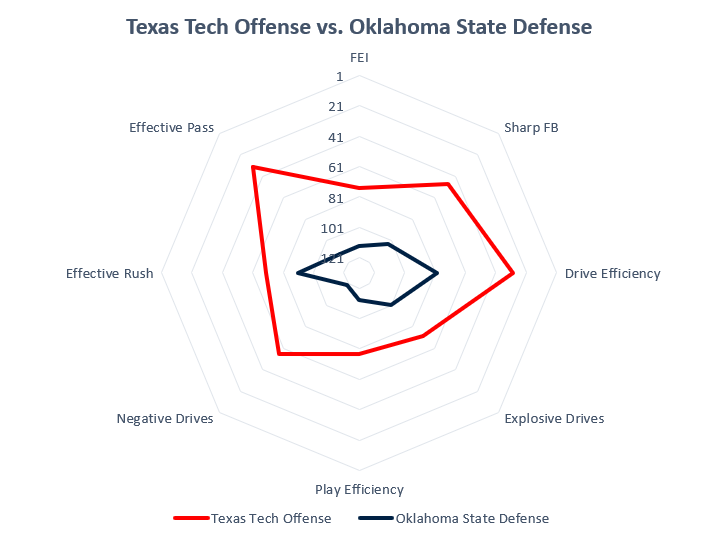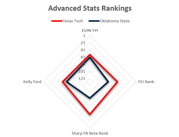 According to ESPN and Kelly Ford, these teams are awfully close, while FEI and Sharp have them a bit separated with Sharp being the biggest difference. Texas Tech’s offense is really good in comparison to the OSU defense, a huge advantage passing and drive efficiency. The Texas Tech defense has issues with the pass defense still and that is the one strength of the Oklahoma State offense (of course). Please note how good the rush defense has been.