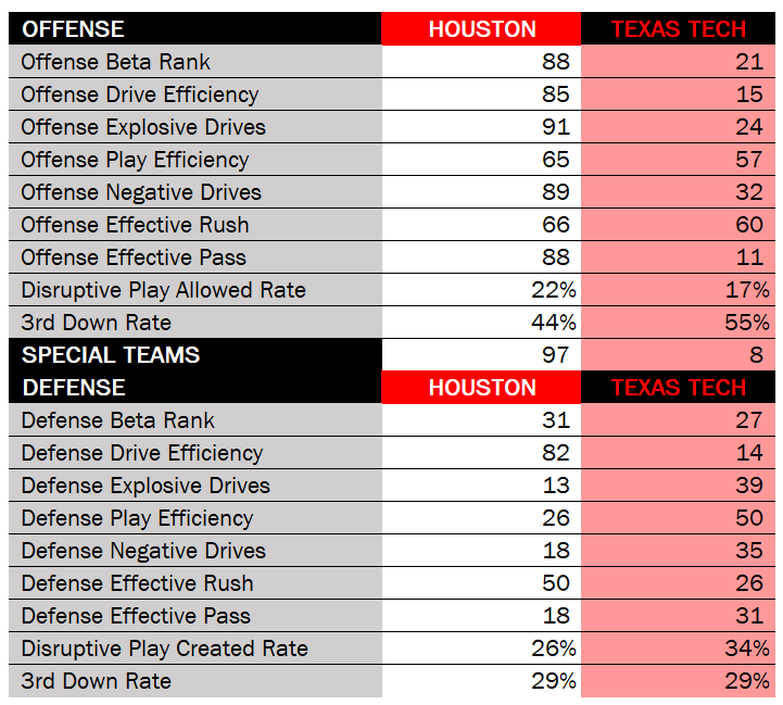 Defensively, I was surprised that the Houston defense was so highly ranked. Just wasn’t expecting it. I mentioned above that the Houston secondary is absolutely dealing and the stats play that out. That may be a product of who they played, but it doesn’t diminish the fact that they are performing as well. Not great at stopping the run, but they are near-elite at stopping explosive drives, although they will allow teams to churn out drives on them. The Texas Tech defense is pretty consistent across the board, top 30-ish in stopping the run and the pass and a pretty good disprity in the disruptive plays created between Texas Tech and Houston. Texas Tech is good at stopping the explosive drives and just grinding offenses to a halt.