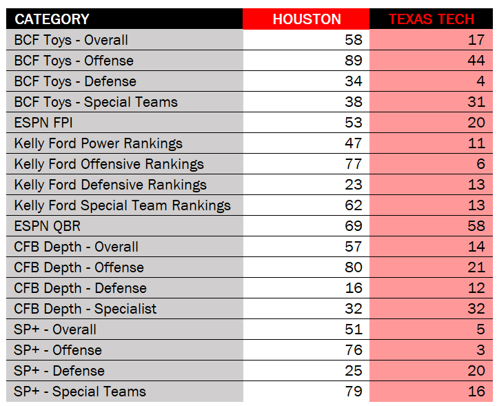 CFB Depth also really likes Texas Tech and the figures for Houston pretty well match the other stats websites.
