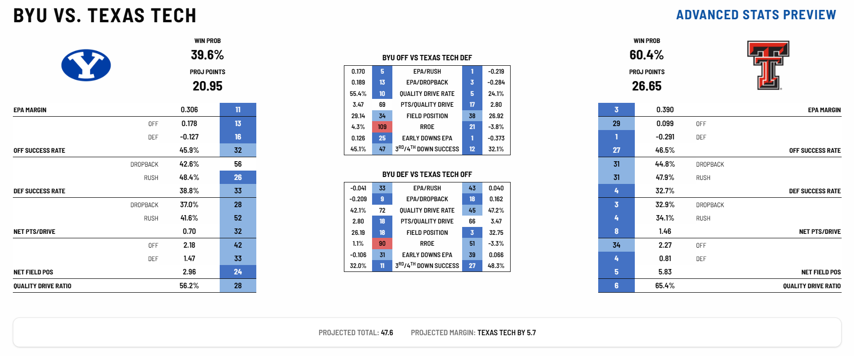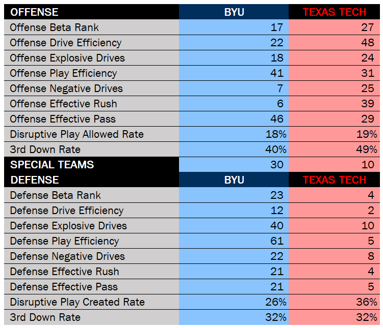 Stats: Beta Rank loves BYU’s offense and especially their ability to run the ball and reduce any negative plays. They’re also plenty decent in terms of explosive plays, so they are pushing the ball down the field. It will be a battle of wills to see how if Texas Tech’s defense is able to make those disruptive plays. Those 3rd down stats are also slightly worse on the road by about 5 percentage points. The BYU defense is also really good overall and not a ton of holes to poke, although they do allow a decent amount of explosive plays plays and allow teams to be more efficient than not.