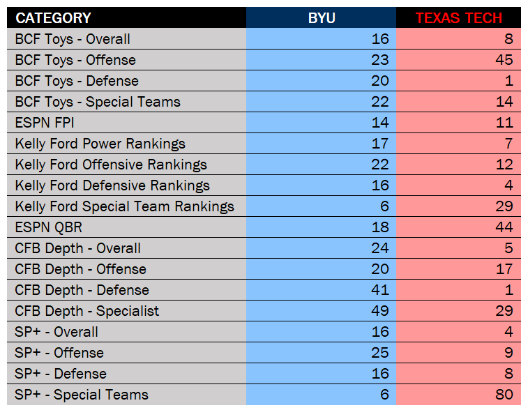 BCF Toys loves the Texas Tech defense, but thinks the offense is mediocre at best, but that’s a pretty big swing from how the rest of the advanced stats see Texas Tech’s offense. Also interesting to look at the variance between special teams, that’s all over the map.