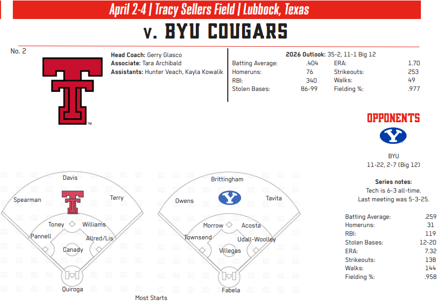 Tech (17-11, 4-5 in the Big 12) will try to get back on track in a home series against Houston (13-14, 1-8) at Dan Law Field/Rip Griffin Park. The games are scheduled for 6:30 p.m. Thursday, April 2; 2 p.m., Friday, April 3; and noon Saturday, April 4. The series is starting a day earlier than usual to avoid playing on Easter Sunday.